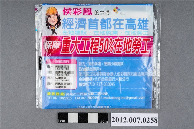 此物件為一選舉宣傳面紙包,此面紙包宣傳的對象為代表中國國民黨參與2012年正副總統選舉的候選人馬英九、吳敦義,以及參選立法委員的侯彩鳳。侯彩鳳為時任立法委員,在此次立法委員選舉中在高雄市爭取連任,但敗給民主進步黨派出的李昆澤。 此物件為2012年第13任總統副總統選舉時中國國民黨候選人的相關宣傳品,此次選舉由代表中國國民黨的馬英九、吳敦義;代表民主進步黨的蔡英文、蘇嘉全;代表親民黨的宋楚瑜、林瑞雄參與選舉。代表國民黨的馬英九在競選中開設「臺灣加油讚」競選辦公室,並且以「不統不獨」的「兩岸」政策爭取選民選票。最終,代表國民黨的馬英九、吳敦義組合當選,馬英九成功連任第13任總統。