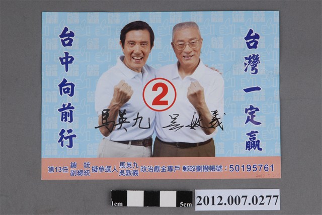 此為選舉宣傳單,標題為「臺中向前行 臺灣一定贏」,正面為中國國民黨總統、副總統候選人馬英九、吳敦義的合照,背面標示了其對於總統選舉、立委選舉、政黨選舉的推薦對象,分別為2號馬英九、吳敦義,2號鄭麗文,5號中國國民黨。此宣傳品為中國國民黨臺中市黨部委員會針對2012年總統、副總統選舉、立法委員選舉所印製。 2012年,中華民國首次將總統、立法委員選舉之投票作業合併施行,此一變革最主要的目標在於減省社會資源,並提升學生族群的參與度。總統、立法委員選舉合併投票的方案,早在2007年即被政府納入規劃,但遲遲未於各政黨間形成共識。此次新制施行,顯見的效應是立委選舉的受關注度遠低於總統選舉,且選民在立委選舉中投票分佈受到總統選情的牽引。最終,中國國民黨在此次立委選舉中單獨取得過半席次,成為國會中的最大政黨。