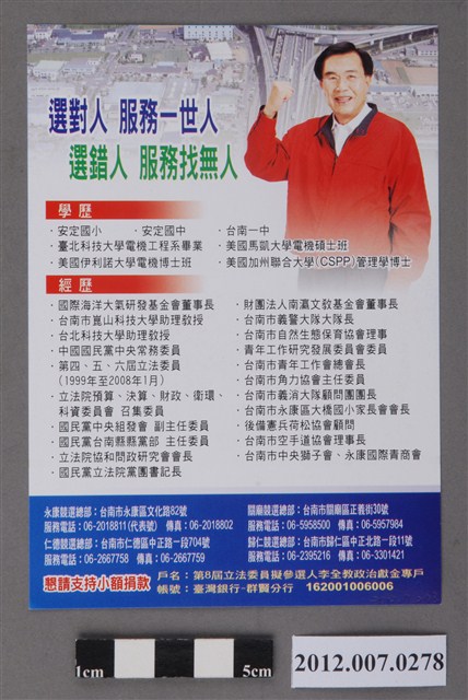 此為選舉宣傳單,標題為「我在你左右」,是李全教於2012年代表中國國民黨參選中華民國第8屆立法委員時所印製的競選廣告,正面為其相片,背面記載其學經歷。 李全教為國民黨籍政治人物,出身臺南,曾任立法委員及臺南市議員。李全教在2014年的臺南市議員任內爭議不斷,先是在民進黨佔多數議席的議長選舉中意外獲勝,而後又因議員、議長選舉涉嫌賄選而遭到起訴判刑。為此,時任臺南市長賴清德在案件偵辦期間悍然拒絕進入議會備詢,引發輿論譁然。 2012年,中華民國首次將總統、立法委員選舉之投票作業合併施行,此一變革最主要的目標在於減省社會資源,並提升學生族群的參與度。總統、立法委員選舉合併投票的方案,早在2007年即被政府納入規劃,但遲遲未於各政黨間形成共識。此次新制施行,顯見的效應是立委選舉的受關注度遠低於總統選舉,且選民在立委選舉中投票分佈受到總統選情的牽引。最終,中國國民黨在此次立委選舉中單獨取得過半席次,成為國會中的最大政黨。