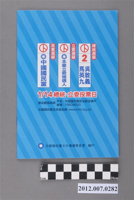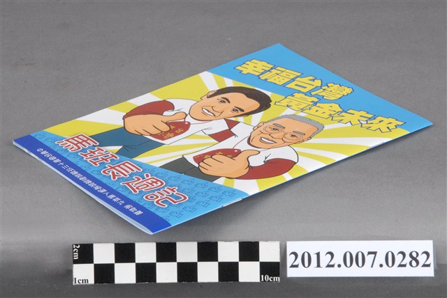 此為一紙質手冊,封面畫有馬英九以及吳敦義的畫像,並寫有「幸福臺灣黃金未來」的字樣,該書冊標題為「馬班長週記」,背面為選舉投票的範例圖,印有「1/14總統、立委投票日」字樣,以及中國國民黨政治獻金專戶的相關資訊,書冊內容為宣傳馬英九的漫畫。 此物件為2012年第13任總統副總統選舉時中國國民黨候選人的相關宣傳品,此次選舉由代表中國國民黨的馬英九、吳敦義;代表民主進步黨的蔡英文、蘇嘉全;代表親民黨的宋楚瑜、林瑞雄參與選舉。代表國民黨的馬英九在競選中開設「臺灣加油讚」競選辦公室,並且以「不統不獨」的「兩岸」政策爭取選民選票。最終,代表國民黨的馬英九、吳敦義組合當選,馬英九成功連任第13任總統。