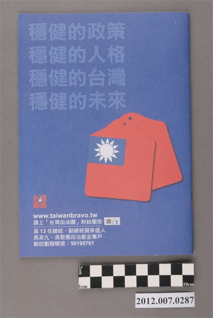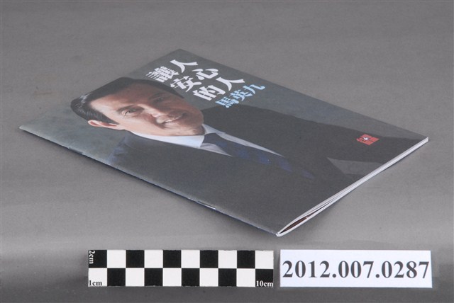 此為一紙質手冊,封面刊有馬英九的相片,並印有「讓人安心的人馬英九」、「臺灣加油」,背面刊有中華民國國旗的香火袋,並印有四個「穩健」的標語,以及宣傳網站的相關資訊以及馬英九、吳敦義政治獻金專戶的相關資訊。手冊內容為馬英九的政績、形象的宣傳。 此物件為2012年第13任總統副總統選舉時中國國民黨候選人的相關宣傳品,此次選舉由代表中國國民黨的馬英九、吳敦義;代表民主進步黨的蔡英文、蘇嘉全;代表親民黨的宋楚瑜、林瑞雄參與選舉。代表國民黨的馬英九在競選中開設「臺灣加油讚」競選辦公室,並且以「不統不獨」的「兩岸」政策爭取選民選票。最終,代表國民黨的馬英九、吳敦義組合當選,馬英九成功連任第13任總統。