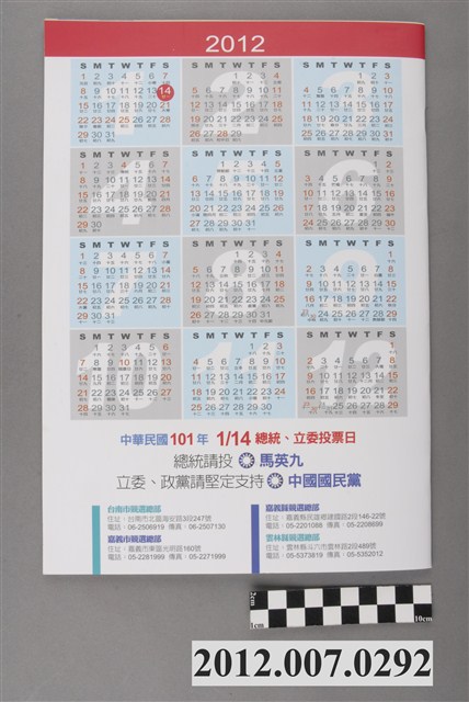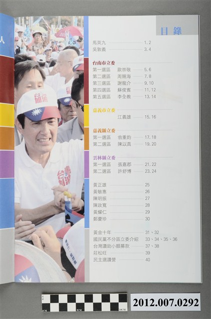 此為《國民黨雲嘉南選區專刊》,封面為總統候選人馬英九相片及「臺灣向前行 臺灣一定贏」標語,封底為2012年年曆,以及中國國民黨雲林、嘉義、臺南競選總部通訊資料。此專刊內容為中國國民黨提名雲嘉南各選區立法委員候選人、全國不分區立委候選人之簡介,是國民黨針對2012年中華民國第8屆立法委員選舉所製作的宣傳品。 2012年,中華民國首次將總統、立法委員選舉之投票作業合併施行,此一變革最主要的目標在於減省社會資源,並提升學生族群的參與度。總統、立法委員選舉合併投票的方案,早在2007年即被政府納入規劃,但遲遲未於各政黨間形成共識。此次新制施行,顯見的效應是立委選舉的受關注度遠低於總統選舉,且選民在立委選舉中投票分佈受到總統選情的牽引。最終,中國國民黨在此次立委選舉中單獨取得過半席次,成為國會中的最大政黨。