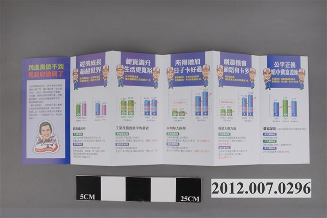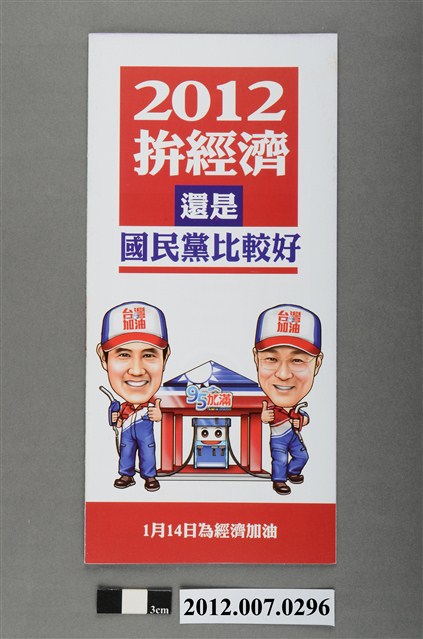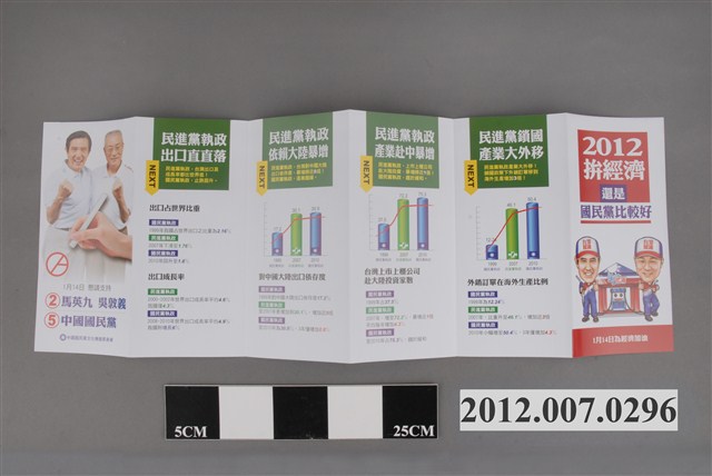 此為一紙直宣傳文宣,封面刊有馬英九以及吳敦義的照片,並印有「1月14日懇請支持 ②馬英九 吳敦義 ⑤ 中國國民黨」的字樣,背面印有「2012拼經濟還是國民黨比較好」字樣,並刊有馬英九與吳敦義的漫畫圖像。內容刊載馬英九政府在經濟方面的執政成績以及批評民主進步黨政府的經濟政策。 此物件為2012年第13任總統副總統選舉時中國國民黨候選人的相關宣傳品,此次選舉由代表中國國民黨的馬英九、吳敦義;代表民主進步黨的蔡英文、蘇嘉全;代表親民黨的宋楚瑜、林瑞雄參與選舉。代表國民黨的馬英九在競選中開設「臺灣加油讚」競選辦公室,並且以「不統不獨」的「兩岸」政策爭取選民選票。最終,代表國民黨的馬英九、吳敦義組合當選,馬英九成功連任第13任總統。