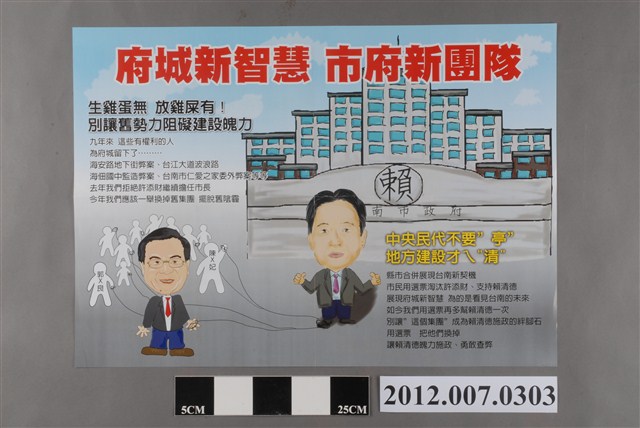 此為選舉宣傳單,標題為「立院新智慧 換人做就對」,是謝龍介參選2012年中華民國第8屆立法委員時所印製,傳單內容瞄準民進黨在臺南市的派系矛盾,以協助臺南市長賴清德市政革新的名義,呼籲選民支持謝龍介,以更替代表舊市政集團利益的綠營立委候選人陳亭妃。 謝龍介為中國國民黨籍政治人物,長期連任臺南市議員,曾數度參選立法委員但未如願當選。謝龍介曾擔任中國國民黨中央常務委員、臺南市黨部主任委員,是國民黨在臺南地區的代表人物,在市議會以臺語流利的形象與前臺南市長賴清德數度針鋒相對,經媒體報導而博得廣泛知名度。 2012年,中華民國首次將總統、立法委員選舉之投票作業合併施行,此一變革最主要的目標在於減省社會資源,並提升學生族群的參與度。總統、立法委員選舉合併投票的方案,早在2007年即被政府納入規劃,但遲遲未於各政黨間形成共識。此次新制施行,顯見的效應是立委選舉的受關注度遠低於總統選舉,且選民在立委選舉中投票分佈受到總統選情的牽引。最終,中國國民黨在此次立委選舉中單獨取得過半席次,成為國會中的最大政黨。