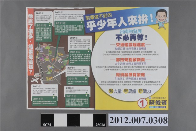 此為選舉宣傳單,標題為「活水來 好未來 改變 就現在!」,是蘇俊賓參選2012年中華民國第8屆立法委員時所印製的競選廣告,此文宣為雙面彩色明信片,印有其相片與相關政見。