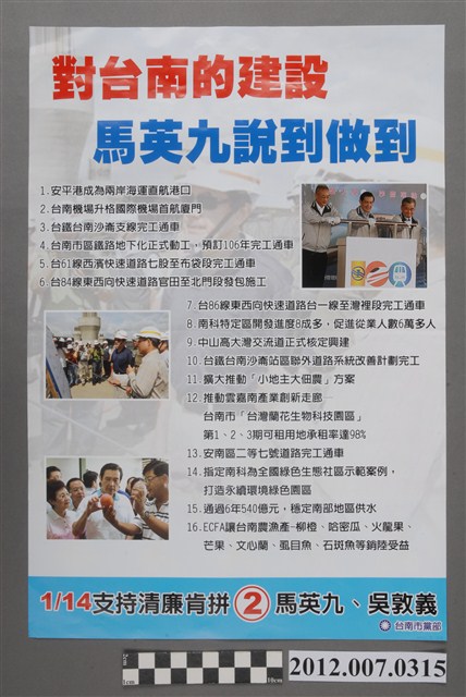 此為一張紙質文宣,為彩色印刷,其中一面標題為「民進黨做不到馬英九做到了」,右方刊有馬英九與吳敦義的照片,中間刊有民進黨政府以及馬英九政府對臺南施政的比較,下方則刊有2012年第8屆立法委員選舉臺南選區的國民黨籍立委候選人照片,另一面標題則是「對臺南的建設馬英九說到做到」,並寫有多個馬英九政府對臺南的政績,並刊有馬英九的照片,右下則署名「臺南市黨部」。 此物件為2012年第13任總統副總統選舉時中國國民黨候選人的相關宣傳品,此次選舉由代表中國國民黨的馬英九、吳敦義;代表民主進步黨的蔡英文、蘇嘉全;代表親民黨的宋楚瑜、林瑞雄參與選舉。代表國民黨的馬英九在競選中開設「臺灣加油讚」競選辦公室,並且以「不統不獨」的「兩岸」政策爭取選民選票。最終,代表國民黨的馬英九、吳敦義組合當選,馬英九成功連任第13任總統。