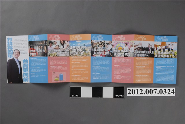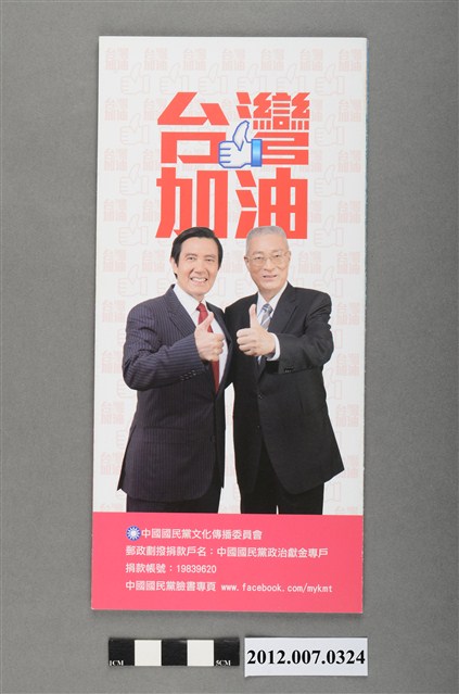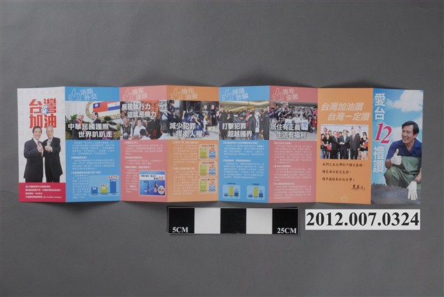 此物件為一紙質選舉折疊文宣,其中一面刊有馬英九與吳敦義照片,上方印有馬英九、吳敦義競選辦公室的「臺灣加油讚」形象Logo,並印有中國國民黨的相關資訊,另一面則有馬英九的照片,並印有標題「愛台12禮讚」,文宣內容則有不同主題的馬英九政府的政績。 此物件為2012年第13任總統副總統選舉時中國國民黨候選人的相關宣傳品,此次選舉由代表中國國民黨的馬英九、吳敦義;代表民主進步黨的蔡英文、蘇嘉全;代表親民黨的宋楚瑜、林瑞雄參與選舉。代表國民黨的馬英九在競選中開設「臺灣加油讚」競選辦公室,並且以「不統不獨」的「兩岸」政策爭取選民選票。最終,代表國民黨的馬英九、吳敦義組合當選,馬英九成功連任第13任總統。