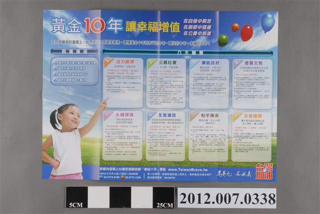 此物件為雙面印刷,三折再對折後使用,是中華民國第13任中國國民黨正副總統候選人馬英九與吳敦義的競選文宣,為其競選辦公室「臺灣加油讚」進行宣傳之用,文宣內容為對客家群眾政策的政見、政績以及被命名為「黃金10年」的政見。 此物件為2012年第13任總統副總統選舉時中國國民黨候選人的相關宣傳品,此次選舉由代表中國國民黨的馬英九、吳敦義;代表民主進步黨的蔡英文、蘇嘉全;代表親民黨的宋楚瑜、林瑞雄參與選舉。代表國民黨的馬英九在競選中開設「臺灣加油讚」競選辦公室,並且以「不統不獨」的「兩岸」政策爭取選民選票。最終,代表國民黨的馬英九、吳敦義組合當選,馬英九成功連任第13任總統。