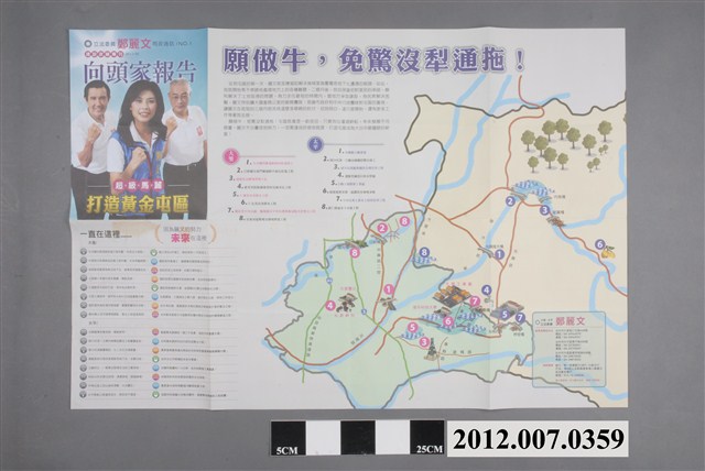 此為選舉宣傳單,標題為「立法委員鄭麗文問政通訊 NO.1――建設政績專刊(2011.11.05)――向頭家報告」,為鄭麗文於2012年為競選中華民國第8屆立法委員所印製。 鄭麗文為解嚴前後進入政壇的「學運世代」政治人物,曾任臺權會秘書長、國大代表、民進黨青年部副主任。鄭麗文在民進黨執政後與黨內主流派形成理念分歧,於2002年退黨。2004年,鄭麗文在藍營批判總統選舉不公的聲浪中以無黨籍身份參選立法委員,並於2005年加入中國國民黨,現為國民黨不分區立委。 2012年,中華民國首次將總統、立法委員選舉之投票作業合併施行,此一變革最主要的目標在於減省社會資源,並提升學生族群的參與度。總統、立法委員選舉合併投票的方案,早在2007年即被政府納入規劃,但遲遲未於各政黨間形成共識。此次新制施行,顯見的效應是立委選舉的受關注度遠低於總統選舉,且選民在立委選舉中投票分佈受到總統選情的牽引。最終,中國國民黨在此次立委選舉中單獨取得過半席次,成為國會中的最大政黨。