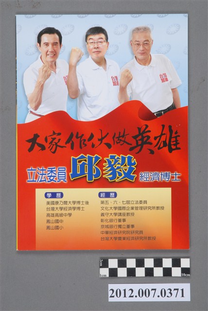 此物件為農民曆,是邱毅於2012年為競選中華民國第8屆立法委員所印製,封底印有邱毅本人,以及其與總統、副總統候選人馬英九、吳敦義的合照。 邱毅出身經濟學界,曾加入社民黨、新黨,並參與地下電台、主持政論談話節目。2000年,邱毅在宋楚瑜的號召下投入親民黨組建工作,並當選立委,連任多屆。邱毅問政以敢衝敢言著稱,曾因此數度被判刑入獄,其政治生涯中雖曾經多次轉換政黨,但並未偏離泛藍、統派立場。 2012年,中華民國首次將總統、立法委員選舉之投票作業合併施行,此一變革最主要的目標在於減省社會資源,並提升學生族群的參與度。總統、立法委員選舉合併投票的方案,早在2007年即被政府納入規劃,但遲遲未於各政黨間形成共識。此次新制施行,顯見的效應是立委選舉的受關注度遠低於總統選舉,且選民在立委選舉中投票分佈受到總統選情的牽引。最終,中國國民黨在此次立委選舉中單獨取得過半席次,成為國會中的最大政黨