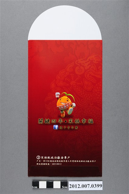 紅包袋正面印有「吉祥如意恭賀新禧」以及宋楚瑜之肖像,背面印有「關鍵四年、宋林幸福」與政治獻金專戶訊息,為中華民國第13任親民黨正副總統候選人宋楚瑜與林瑞雄競選團隊「橘子青年軍」進行宣傳之用。