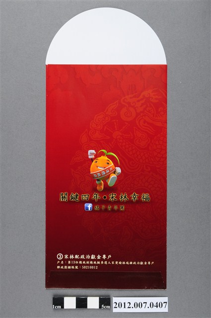 紅包袋正面印有「吉祥如意恭賀新禧」以及宋楚瑜之肖像,背面印有「關鍵四年、宋林幸福」與政治獻金專戶訊息,為中華民國第13任親民黨正副總統候選人宋楚瑜與林瑞雄競選團隊「橘子青年軍」進行宣傳之用。