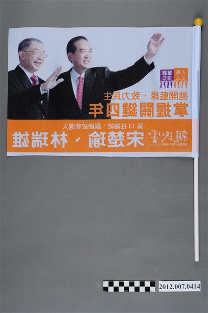 此物件為一競選旗幟,上方印有2012年親民黨正副總統候選人宋楚瑜、林瑞雄的照片,並印有「拋開藍綠.致力民生」、「人民至上」、「重建信任」、「掌握關鍵四年」等字樣,下方則印有親民黨黨徽以及「第13任總統、副總統參選人宋楚瑜、林瑞雄」的字樣。 此物件與2012總統選舉參選人的宋楚瑜、林瑞雄有所關聯,此次選舉由代表中國國民黨的馬英九、吳敦義;代表民主進步黨的蔡英文、蘇嘉全;代表親民黨的宋楚瑜、林瑞雄參與選舉。宋楚瑜於2011年9月投入總統選舉,此事件對於既有的選戰局勢產生影響。宋楚瑜在選舉中提出「拋開藍綠」的競選策略,希望以第三勢力的姿態爭取選民支持。最終,代表國民黨的馬英九、吳敦義組合當選,馬英九成功連任第13任總統。