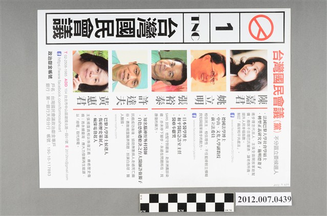 此為選舉宣傳單,標題為「你的一張 政黨票 決定34席不分區立委」,為臺灣國民會議黨於2012年因應全國不分區立委選舉所印製。 臺灣國民會議為2006年倒扁運動中「紅衫軍」脈絡的延伸,其前身為2007年成立的「紅黨」。紅黨以施明德為首,訴求民主反貪、自由貿易,反對藍綠、兩岸惡鬥。2011年,紅黨改名為臺灣國民會議,而後再於2015年改名為臺灣人權聯盟。 2012年,中華民國首次將總統、立法委員選舉之投票作業合併施行,此一變革最主要的目標在於減省社會資源,並提升學生族群的參與度。總統、立法委員選舉合併投票的方案,早在2007年即被政府納入規劃,但遲遲未於各政黨間形成共識。此次新制施行,顯見的效應是立委選舉的受關注度遠低於總統選舉,且選民在立委選舉中投票分佈受到總統選情的牽引。最終,中國國民黨在此次立委選舉中單獨取得過半席次,成為國會中的最大政黨。