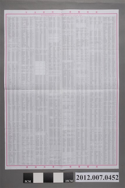 此物件為一紙質政府文宣公告,正面印有標題,標題為《第13任總統副總統選舉選舉公報》,並署名由「新北市選舉委員會」編印,其中刊有三組總統副總統候選人的照片,並刊載候選人的相關資料,另外印有投票的相關規範以及資訊。背面為該屆選舉的各區投票所、開票所一覽表。 此物件為2012年的第13任總統副總統選舉的相關文宣,此次選舉由代表中國國民黨的馬英九、吳敦義;代表民主進步黨的蔡英文、蘇嘉全;代表親民黨的宋楚瑜、林瑞雄參與選舉。在選舉當中,中國與臺灣的「兩岸政見議題」成為人民選舉的重要觀察指標(王顥穎,2015:48-75)。另外、「塑化劑」、「宇昌案」、「夢想家音樂劇」、「三隻小豬」等等,都成為影響當時人民投票意向的事件。最終,代表國民黨的馬英九、吳敦義組合當選,馬英九成功連任第13任總統。 臺灣的總統選舉制度,依據中華民國憲法實施,憲法起草者張君勱參考德國威瑪共和國憲法,在其基礎上加以調整以符合中國社會狀況。在選舉執行層面,在中國國民黨政府內部進行一系列憲政修正過後,國民大會間接投票選出總統成為最初的總統選舉模式。之後民間爭取總統直選的訴求可追溯至1970年代初期,雷震提出的〈救亡圖存獻議〉與許世楷等均曾提出倡議;而1980年代,則由當時在野的民主進步黨正式提出總統直選之訴求。最終直選訴求在1990年代為國民黨主流派所接受,臺灣社會在朝野共識下於1996年實施了首次的總統民選。1997年,臺灣被美國歷史最悠久的人權團體之一「自由之家」(Freedom House)評定為「完全自由國家」。(薛化元,2016:6-25)