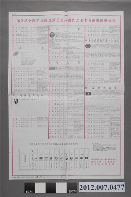 此物件為第8屆全國不分區及僑居國外國民立法委員選舉選舉公報,記載各黨派候選人相關資料,投票日期為2012年1月14日,印發單位為彰化縣選舉委員會。 2012年,中華民國首次將總統、立法委員選舉之投票作業合併施行,此一變革的目的在於減省社會資源、減少社會對立等等。總統、立法委員選舉合併投票的方案,早在2007年中華民國第12屆總統選舉前,即被政府納入規劃,但遲遲未於各政黨間形成共識。而在2012年的第8屆立法委員選舉中,中國國民黨在立法院總席次中單獨取得過半席次,成為當屆國會中的最大政黨。 臺灣的立法委員選舉始於1948年,在1947年的國民大會代表選舉之後接續展開。立法委員任期原為3年一任,但因國民黨政府制定「動員戡亂時期臨時條款」凍結憲法部分條文等原因之下,首屆立法委員的任期被持續延長,形成長達40餘年未改選之現象,是為「萬年國會」。1972年起,中華民國政府開始定期舉辦「增額立法委員選舉」。解嚴後,於1992年展開中央民意代表的全面改選。在2008年的第7屆立法委員選舉中,立委選制由「複數選區不可讓度制」改為「單一選區兩票制」,立委任期也改為4年。2012年,則修改選務期程,使立法委員與總統選舉一併舉行。