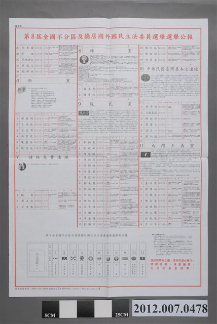 此物件為第8屆全國不分區及僑居國外國民立法委員選舉選舉公報,記載各黨派候選人相關資料,投票日期為2012年1月14日,印發單位為雲林縣選舉委員會。 2012年,中華民國首次將總統、立法委員選舉之投票作業合併施行,此一變革的目的在於減省社會資源、減少社會對立等等。總統、立法委員選舉合併投票的方案,早在2007年中華民國第12屆總統選舉前,即被政府納入規劃,但遲遲未於各政黨間形成共識。而在2012年的第8屆立法委員選舉中,中國國民黨在立法院總席次中單獨取得過半席次,成為當屆國會中的最大政黨。 臺灣的立法委員選舉始於1948年,在1947年的國民大會代表選舉之後接續展開。立法委員任期原為3年一任,但因國民黨政府制定「動員戡亂時期臨時條款」凍結憲法部分條文等原因之下,首屆立法委員的任期被持續延長,形成長達40餘年未改選之現象,是為「萬年國會」。1972年起,中華民國政府開始定期舉辦「增額立法委員選舉」。解嚴後,於1992年展開中央民意代表的全面改選。在2008年的第7屆立法委員選舉中,立委選制由「複數選區不可讓度制」改為「單一選區兩票制」,立委任期也改為4年。2012年,則修改選務期程,使立法委員與總統選舉一併舉行。