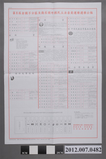 此物件為第8屆全國不分區及僑居國外國民立法委員選舉選舉公報,記載各黨派候選人相關資料,投票日期為2012年1月14日,印發單位為屏東縣選舉委員會。 2012年,中華民國首次將總統、立法委員選舉之投票作業合併施行,此一變革的目的在於減省社會資源、減少社會對立等等。總統、立法委員選舉合併投票的方案,早在2007年中華民國第12屆總統選舉前,即被政府納入規劃,但遲遲未於各政黨間形成共識。而在2012年的第8屆立法委員選舉中,中國國民黨在立法院總席次中單獨取得過半席次,成為當屆國會中的最大政黨。 臺灣的立法委員選舉始於1948年,在1947年的國民大會代表選舉之後接續展開。立法委員任期原為3年一任,但因國民黨政府制定「動員戡亂時期臨時條款」凍結憲法部分條文等原因之下,首屆立法委員的任期被持續延長,形成長達40餘年未改選之現象,是為「萬年國會」。1972年起,中華民國政府開始定期舉辦「增額立法委員選舉」。解嚴後,於1992年展開中央民意代表的全面改選。在2008年的第7屆立法委員選舉中,立委選制由「複數選區不可讓度制」改為「單一選區兩票制」,立委任期也改為4年。2012年,則修改選務期程,使立法委員與總統選舉一併舉行。