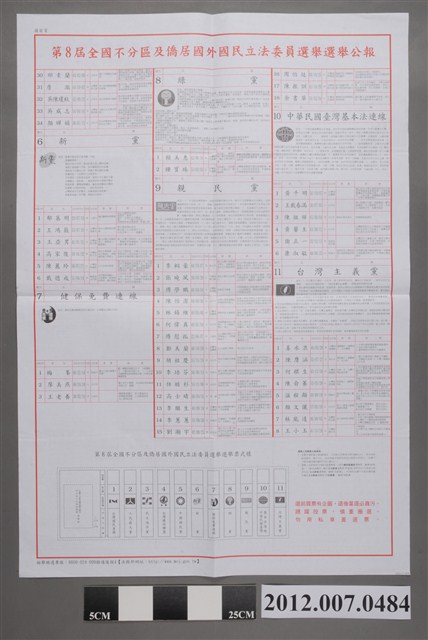 此物件為第8屆全國不分區及僑居國外國民立法委員選舉選舉公報,記載各黨派候選人相關資料,投票日期為2012年1月14日,印發單位為花蓮縣選舉委員會。 2012年,中華民國首次將總統、立法委員選舉之投票作業合併施行,此一變革的目的在於減省社會資源、減少社會對立等等。總統、立法委員選舉合併投票的方案,早在2007年中華民國第12屆總統選舉前,即被政府納入規劃,但遲遲未於各政黨間形成共識。而在2012年的第8屆立法委員選舉中,中國國民黨在立法院總席次中單獨取得過半席次,成為當屆國會中的最大政黨。 臺灣的立法委員選舉始於1948年,在1947年的國民大會代表選舉之後接續展開。立法委員任期原為3年一任,但因國民黨政府制定「動員戡亂時期臨時條款」凍結憲法部分條文等原因之下,首屆立法委員的任期被持續延長,形成長達40餘年未改選之現象,是為「萬年國會」。1972年起,中華民國政府開始定期舉辦「增額立法委員選舉」。解嚴後,於1992年展開中央民意代表的全面改選。在2008年的第7屆立法委員選舉中,立委選制由「複數選區不可讓度制」改為「單一選區兩票制」,立委任期也改為4年。2012年,則修改選務期程,使立法委員與總統選舉一併舉行。