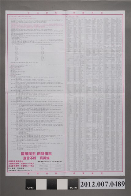 此物件為第8屆立法委員選舉選舉公報(新北市第1、8、9選舉區),記載此選舉區的各候選人資料以及投票相關規範,投票日期為2012年1月14日,編印單位為新北市選舉委員會。 2012年,中華民國首次將總統、立法委員選舉之投票作業合併施行,此一變革的目的在於減省社會資源、減少社會對立等等。總統、立法委員選舉合併投票的方案,早在2007年中華民國第12屆總統選舉前,即被政府納入規劃,但遲遲未於各政黨間形成共識。而在2012年的第8屆立法委員選舉中,中國國民黨在立法院總席次中單獨取得過半席次,成為當屆國會中的最大政黨。 臺灣的立法委員選舉始於1948年,在1947年的國民大會代表選舉之後接續展開。立法委員任期原為3年一任,但因國民黨政府制定「動員戡亂時期臨時條款」凍結憲法部分條文等原因之下,首屆立法委員的任期被持續延長,形成長達40餘年未改選之現象,是為「萬年國會」。1972年起,中華民國政府開始定期舉辦「增額立法委員選舉」。解嚴後,於1992年展開中央民意代表的全面改選。在2008年的第7屆立法委員選舉中,立委選制由「複數選區不可讓度制」改為「單一選區兩票制」,立委任期也改為4年。2012年,則修改選務期程,使立法委員與總統選舉一併舉行。