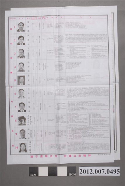 此物件為第8屆立法委員選舉選舉公報(臺中市第五選舉區――北屯區、北區),記載此選舉區的各候選人資料以及投票相關規範,投票日期為2012年1月14日,編印單位為臺中市選舉委員會。 2012年,中華民國首次將總統、立法委員選舉之投票作業合併施行,此一變革的目的在於減省社會資源、減少社會對立等等。總統、立法委員選舉合併投票的方案,早在2007年中華民國第12屆總統選舉前,即被政府納入規劃,但遲遲未於各政黨間形成共識。而在2012年的第8屆立法委員選舉中,中國國民黨在立法院總席次中單獨取得過半席次,成為當屆國會中的最大政黨。 臺灣的立法委員選舉始於1948年,在1947年的國民大會代表選舉之後接續展開。立法委員任期原為3年一任,但因國民黨政府制定「動員戡亂時期臨時條款」凍結憲法部分條文等原因之下,首屆立法委員的任期被持續延長,形成長達40餘年未改選之現象,是為「萬年國會」。1972年起,中華民國政府開始定期舉辦「增額立法委員選舉」。解嚴後,於1992年展開中央民意代表的全面改選。在2008年的第7屆立法委員選舉中,立委選制由「複數選區不可讓度制」改為「單一選區兩票制」,立委任期也改為4年。2012年,則修改選務期程,使立法委員與總統選舉一併舉行。