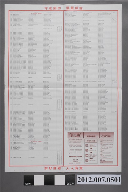 此物件為第8屆立法委員選舉選舉公報(高雄市第三選舉區――楠梓區、左營區),記載此選舉區的各候選人資料以及投票相關規範,投票日期為2012年1月14日,編印單位為高雄市選舉委員會。 2012年,中華民國首次將總統、立法委員選舉之投票作業合併施行,此一變革的目的在於減省社會資源、減少社會對立等等。總統、立法委員選舉合併投票的方案,早在2007年中華民國第12屆總統選舉前,即被政府納入規劃,但遲遲未於各政黨間形成共識。而在2012年的第8屆立法委員選舉中,中國國民黨在立法院總席次中單獨取得過半席次,成為當屆國會中的最大政黨。 臺灣的立法委員選舉始於1948年,在1947年的國民大會代表選舉之後接續展開。立法委員任期原為3年一任,但因國民黨政府制定「動員戡亂時期臨時條款」凍結憲法部分條文等原因之下,首屆立法委員的任期被持續延長,形成長達40餘年未改選之現象,是為「萬年國會」。1972年起,中華民國政府開始定期舉辦「增額立法委員選舉」。解嚴後,於1992年展開中央民意代表的全面改選。在2008年的第7屆立法委員選舉中,立委選制由「複數選區不可讓度制」改為「單一選區兩票制」,立委任期也改為4年。2012年,則修改選務期程,使立法委員與總統選舉一併舉行。