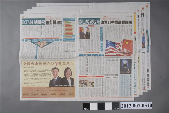 此為2012年1月11日發行的《自由時報》A版,此物件共計5張、18個版面。 此物件刊載2012年的第13任總統副總統選舉的相關報導,此次選舉由代表中國國民黨的馬英九、吳敦義;代表民主進步黨的蔡英文、蘇嘉全;代表親民黨的宋楚瑜、林瑞雄參與選舉。在選舉當中,中國與臺灣的「兩岸政見議題」成為人民選舉的重要觀察指標(王顥穎,2015:48-75)。另外、「塑化劑」、「宇昌案」、「夢想家音樂劇」、「三隻小豬」等等,都成為影響當時人民投票意向的事件。最終,代表國民黨的馬英九、吳敦義組合當選,馬英九成功連任第13任總統。 《自由時報》由聯邦集團林榮三經營。1988年報禁開放後,《自由時報》由地方媒體轉型為全國性報紙。《自由時報》在聯邦集團龐大的資源挹注下,在1997年前後大幅擴展訂戶數,開始與《聯合報》、《中國時報》並列為臺灣三大報。