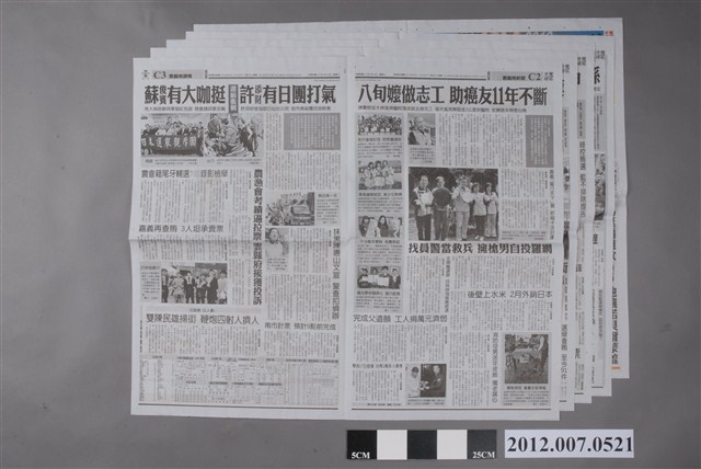 此為2012年1月14日發行的《中國時報》A、C版,此物件共計5張、17個版面。 此物件刊載2012年的第13任總統副總統選舉的相關報導,此次選舉由代表中國國民黨的馬英九、吳敦義;代表民主進步黨的蔡英文、蘇嘉全;代表親民黨的宋楚瑜、林瑞雄參與選舉。在選舉當中,中國與臺灣的「兩岸政見議題」成為人民選舉的重要觀察指標(王顥穎,2015:48-75)。另外、「塑化劑」、「宇昌案」、「夢想家音樂劇」、「三隻小豬」等等,都成為影響當時人民投票意向的事件。最終,代表國民黨的馬英九、吳敦義組合當選,馬英九成功連任第13任總統。 《中國時報》的前身為《徵信新聞報》,是由曾任中國國民黨中央常務委員的余紀忠所創立報紙,在1968年9月起改名為《中國時報》。在余紀忠主導下,《中國時報》被譽為「文人辦報」之代表,之後余紀忠於2002年逝世。中國時報報系自2007年起改組轉型為「中時媒體集團」,2008年,中時媒體集團為旺旺集團所收購,更名為「旺旺中時媒體集團」。