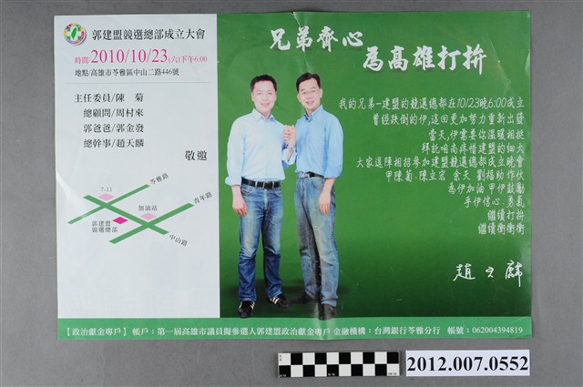 此物件為選舉活動傳單,主旨為「郭建盟競選總部成立大會 做伙來挺郭建宏」,此傳單以名人推薦、邀約的形式形成宣傳效果。 本件所提及的候選人郭建盟,為臺灣知名歌手郭金發之子曾任高雄市政府市長辦公室副主任、高雄市民政局主任秘書,並於2010、2014年由民主進步黨提名,兩度當選高雄市議員。 2010年11月27日舉辦的中華民國直轄市市長暨市議員選舉、中華民國直轄市里長選舉,實施範圍包含當時新形成的5個直轄市:臺北市、新北市、臺中市、臺南市及高雄市。是次選舉,對於臺北市之外的其餘四者而言,皆為改制或區域合併後的首次地方公職選舉,大眾媒體普遍以「五都選舉」稱之,此次五都選舉的結果為:臺北市:郝龍斌、新北市:朱立倫、臺中市:胡志強、臺南市:賴清德、高雄市:陳菊,其中臺北、新北、臺中市長由中國國民黨取得,臺南、高雄市長由民主進步黨取得。