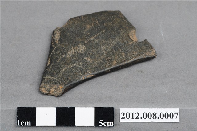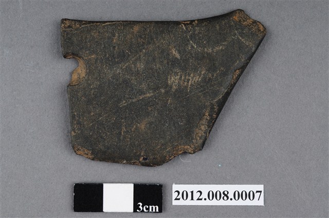 2. 本件器型已殘斷,自中央帶穿處斷裂成半,剩餘右側1/2,器表遍布許多刮痕。尖角及刃角缺損。