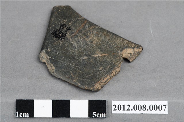 1. 本件為劉鵠雄先生採集於1995年採集,採集地點為臺中龍泉村遺址。本件為馬鞍型磨製石刀,黑色板岩材質,全件通體粗磨呈扁平長方狀,器身上方平直,左右兩端上方向上翹起,宛如馬鞍故名,中央帶一穿孔,下方刃部加工細磨成中鋒刃。