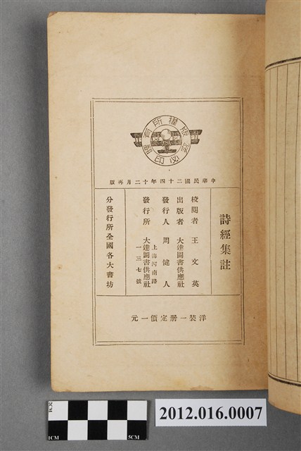 本件《銅版詩經集註》是由上海大達圖書供應社刊行,內文刊載《詩經》及其註評,封面中間有「精校本」、「銅版詩經集訴」、「大達書書供應社刊行」等字,下方蓋有方形印章,周邊有設計圖案。背面中間有飛機圖案,兩翼上有「大達」2字,下方有手寫「1936.8.4購於星光書局」等字,外觀老舊,保存完整。