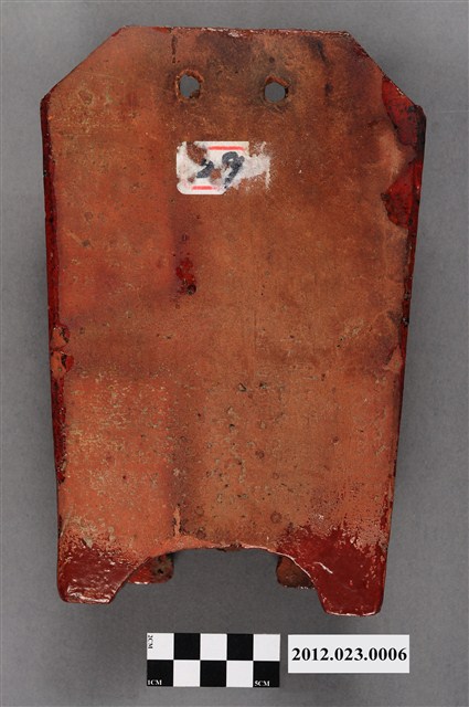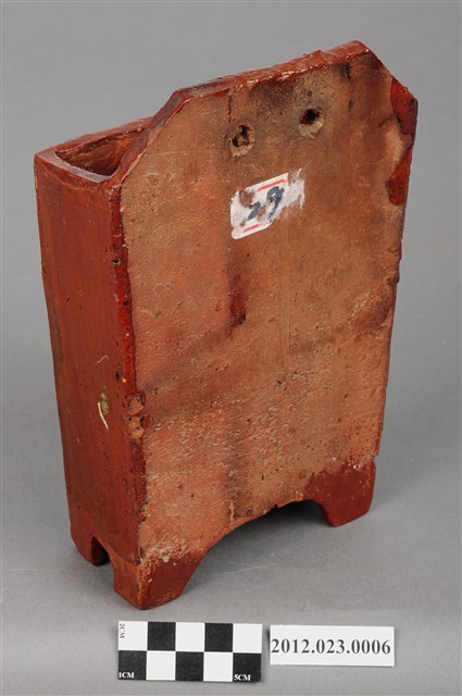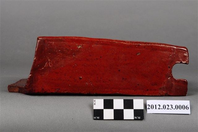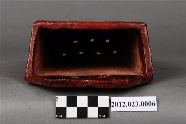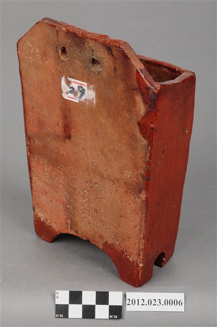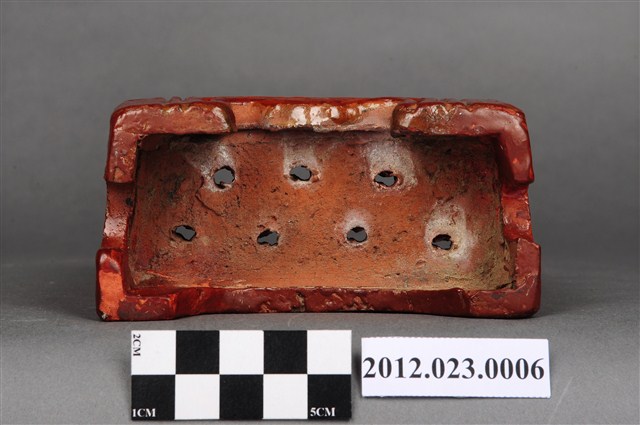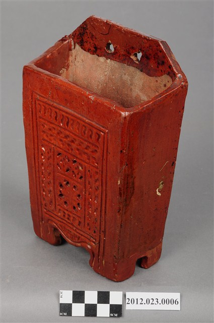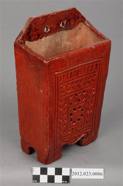 箸籠,又名「筷子籠」、「筷子筒」,用來裝放筷子的用具、懸掛於廚房牆壁上。本件為磚胎素燒,正面上褐色釉,上寬下窄,底部有7個小孔,可讓水容易流出籠外,底下有圈足墊高,利於透氣,保持乾燥,造型簡樸,圖案為淺雕草紋,可能為日本時代晚期至戰後的物件。