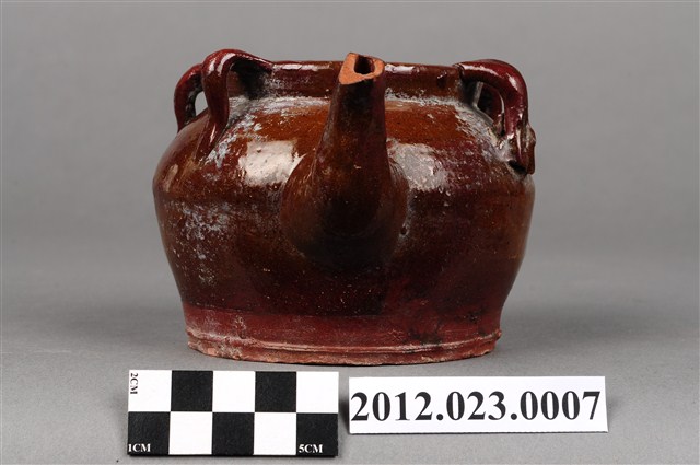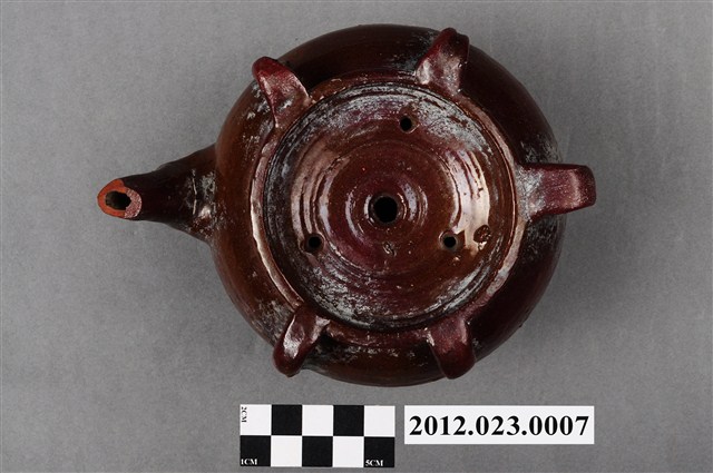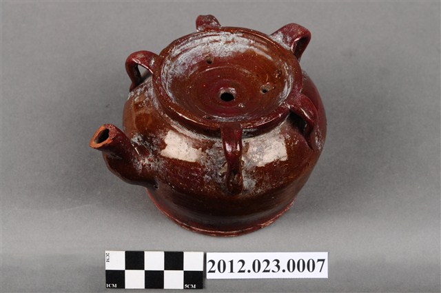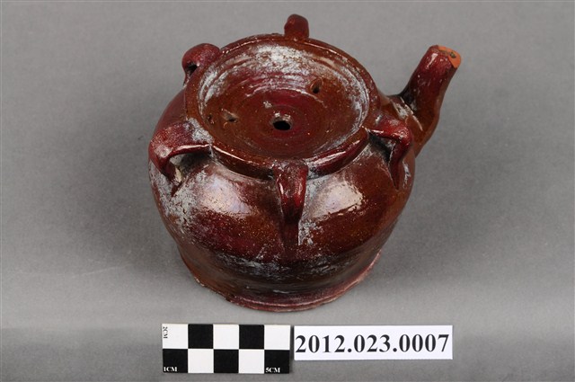 盛裝燻油的容器,除了可以裝燻油外也用來裝茶油。本件磚胎素燒上褐色釉,外形近似「茶壺」,腹部渾圓,頂部則為碟形,鑽有1個主洞、3個小洞,並黏有5個繫耳,形狀很像一朵梅花又稱為五梅 ,接有流嘴。壺嘴有破損情形,壺底留有因展示而殘留的透明膠。