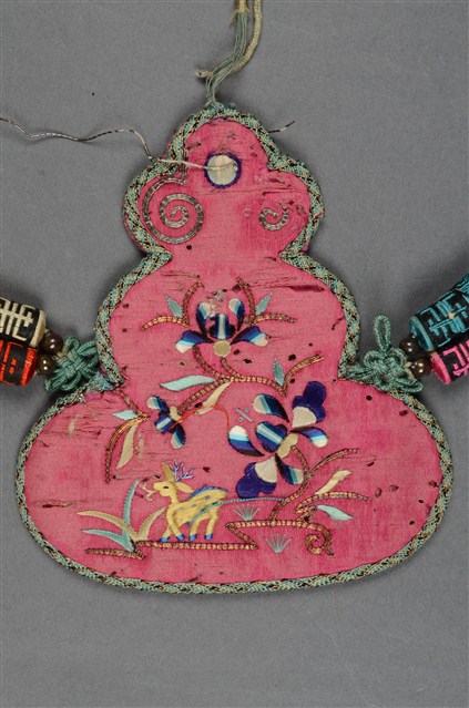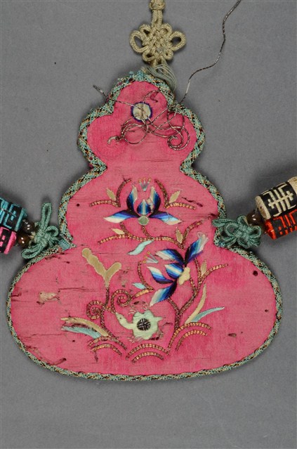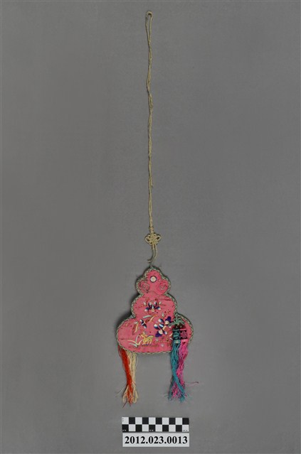 葫蘆造型的煙絲袋,用來盛放煙絲,綁在腰間或旱煙管上,紅底、雙面彩繡,繡有鹿、烏龜與花卉等吉祥圖案,象徵祿位與長壽,左右縫綴有壽字結飾,織品略有破損情形。經查本館無相同品項,建議入藏。 100/10/29-101/03/25期間曾於臺灣工藝研究發展中心「工藝印記-臺灣百年工藝文化特展」展出。