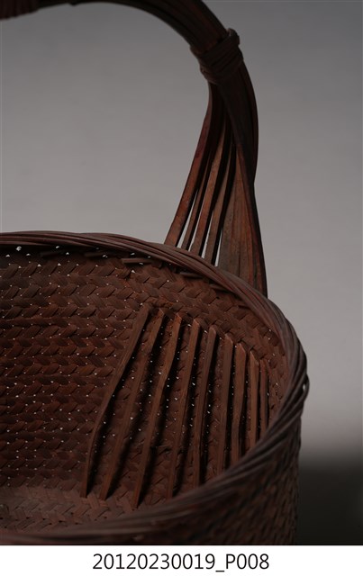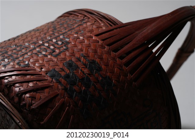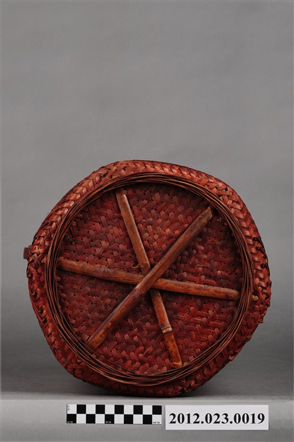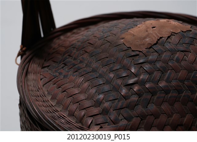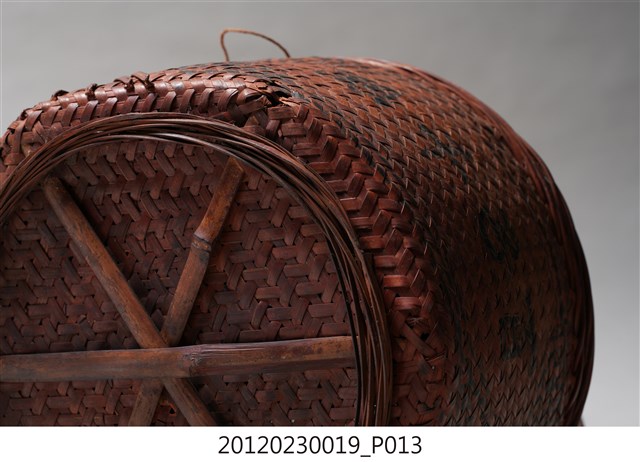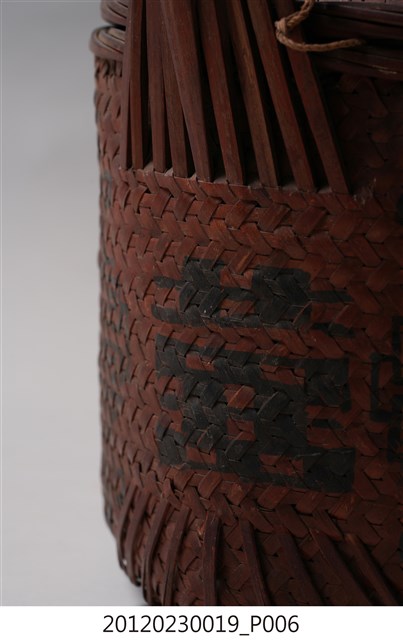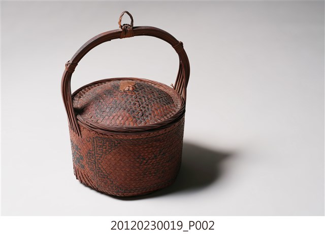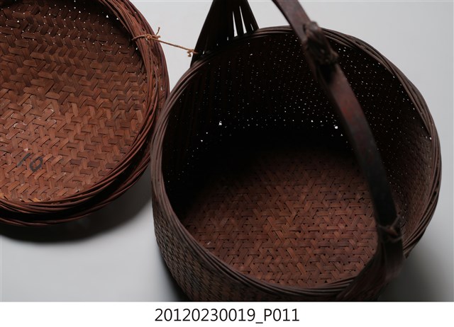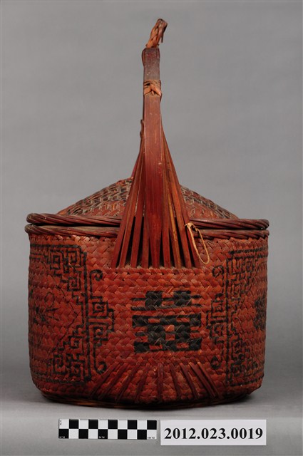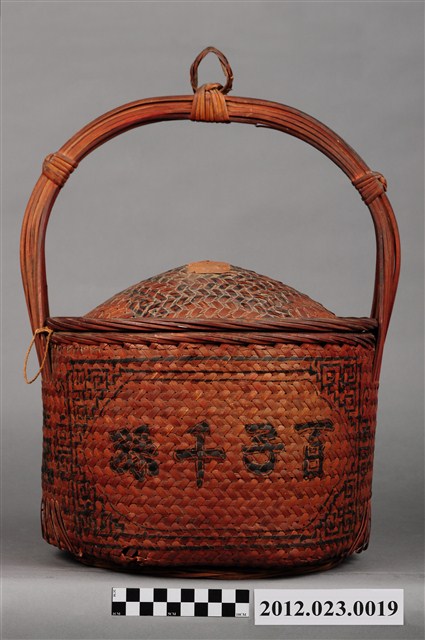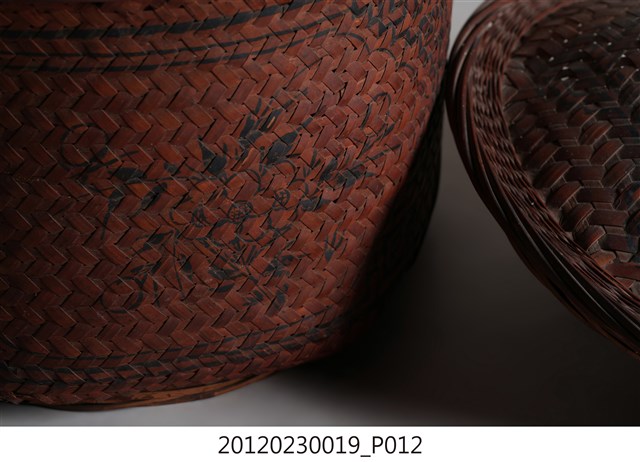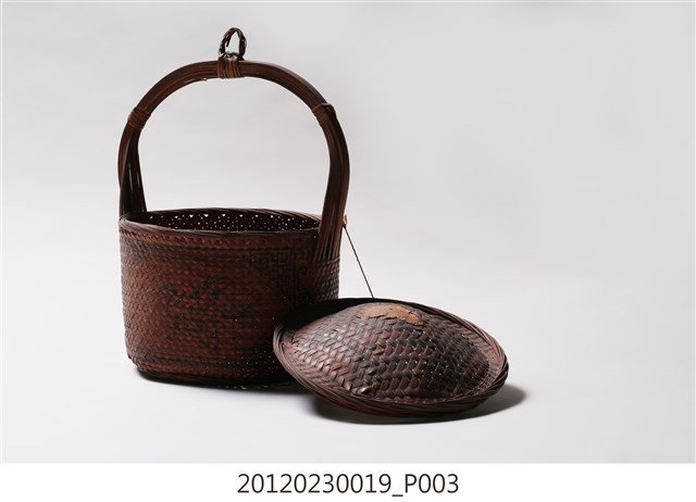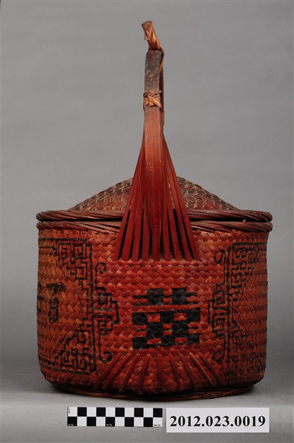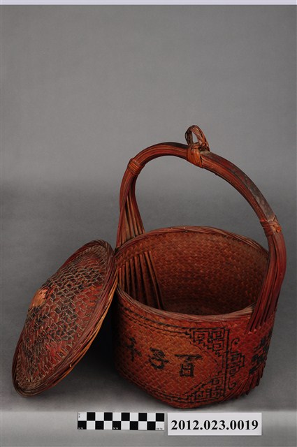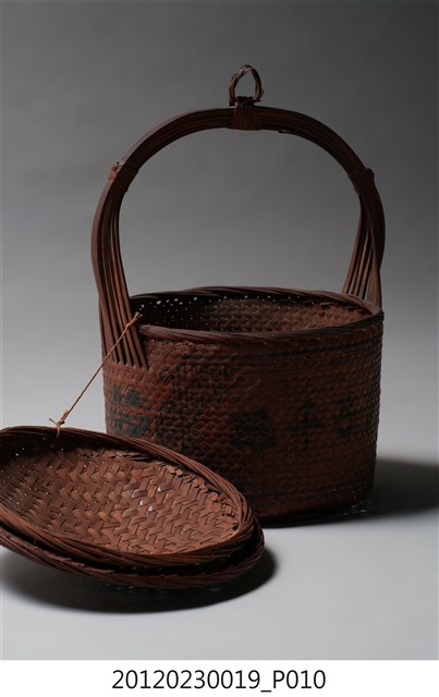 結婚使用的竹編謝籃,用以盛裝禮品及祭品。本件為圓形,主要以竹篾與籐條編織,由籃身與頂篕組合而成,提把以9股寬竹片交叉成「ㄇ」字形,上有圈形紐,可插入扁擔用以挑肩。籃身除漆有特別的保護漆外,籃腹及頂蓋皆有繪畫,籃腹以黑墨繪出「百子千孫」、「囍」字紋及花卉畫,頂蓋則為龜甲紋。底部略有竹篾脆化、破損情形。本件與本館藏品2002.004.0075,形式相近,清楚可見竹編紋路之美,屬竹編上品,可作為展示替換使用。