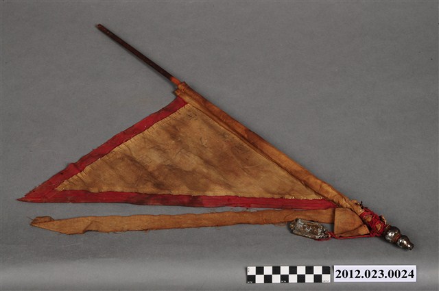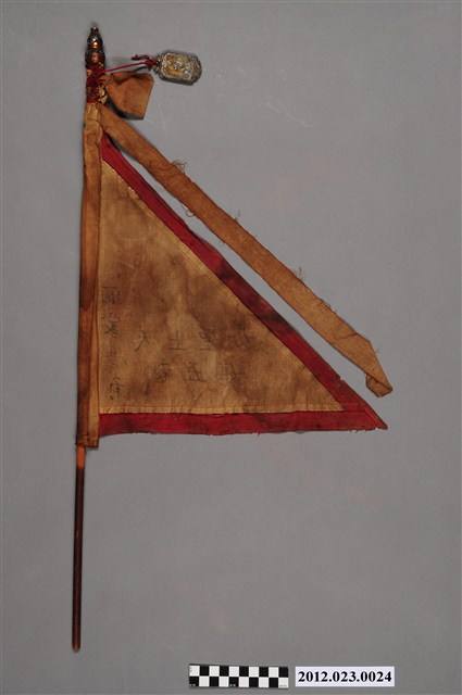 1.本物件為頭家厝角老五媽北港朝天宮進香旗,是香客侯佳典進香時所手持,至香爐過爐後將香火引回家保祐,祈求平安。一般進香旗於進香活動結束後,會將香旗供奉於家中,不會隨意丟棄。旗面為三角形,以竹子作為骨幹,最上端掛有金屬製葫蘆裝飾,以及布面的平安符、金屬製的「天上聖母」符牌與一條劍帶。旗面上以毛筆書寫進香目的地的廟宇「頭家厝角、天上聖母、老五媽、北港朝天宮」等字,並蓋有北港朝天宮的平安印,旗面側邊並寫有香客名等資訊:「台中市北屯區仁美里豐樂路53號三月二十六日北港進香侯佳典」。2.進香原指信徒至名山寺廟朝拜,臺灣因早期移民而移植原籍神明,出現不少分靈或分香的廟宇,因而出現回到祖廟進香以維持其靈威與虔誠性的活動。臺灣著名的進香聖地以王爺廟與媽祖廟為盛,如臺南市南鯤鯓代天府以及大甲媽祖與白沙屯媽祖。進香是為了掬取香火,使本廟的香火興旺,故有更新、增強香火的意義,活動本身亦是社會變遷、常民文化的展現。3.北港朝天宮,是於西元1694年奉請湄洲媽祖渡海來臺,而後開基立廟,起初於簡單的小廟宇祭祀,後著手建廟並於西元1700年竣工,主祀天上聖母,迄今信眾遍布全臺。
