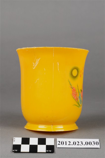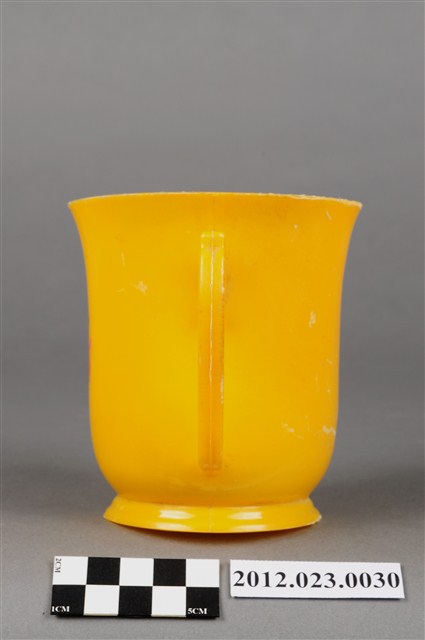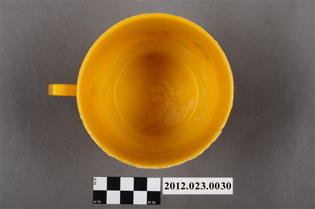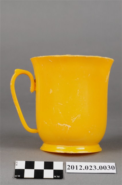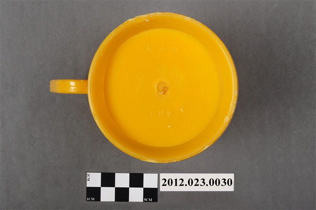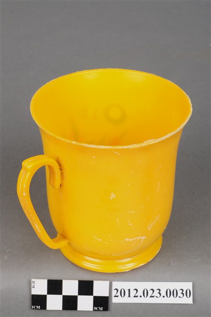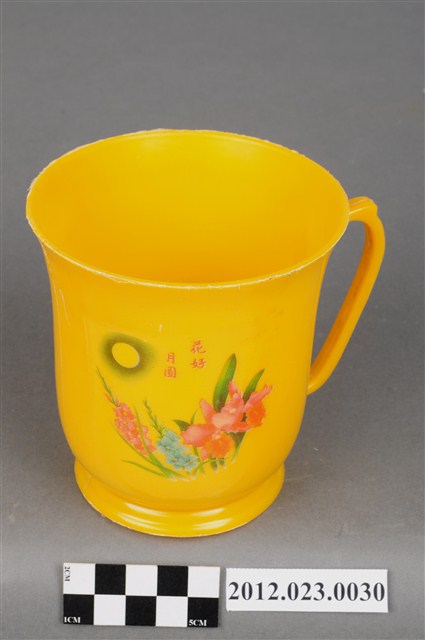 同心牌塑膠製漱口杯,黃色,杯腹印有「花好月圓」蘭花、月亮等圖案,杯底印有「同心牌、CUP」字樣,為常見的漱口杯形式,屬戰後初期的物件。