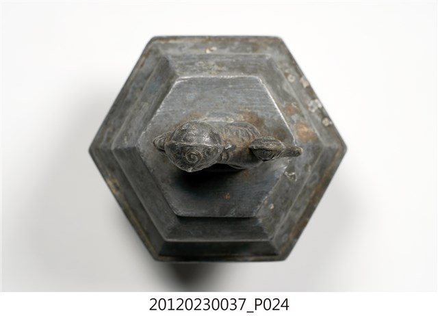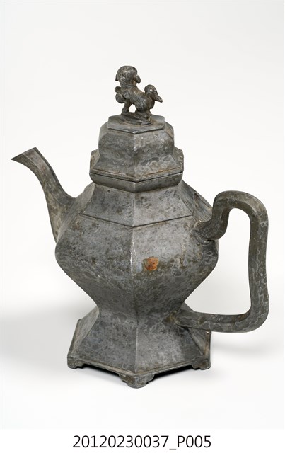 錫製酒壺,為祭祀敬神時盛酒所使用的禮器,手工打錫製作。「錫」諧音「賜」,具有「賜福」的吉祥象徵意義,因此一般祭神的禮器多半採用錫器。壺身造型為六角菱形,腹大縮足,具有長曲線、線條流暢的把手與壺嘴,壺蓋上有「獅子綵球」的提紐,意喻「張燈結綵、祈求太平」。壺底鉻印有「東興」的錫舖店號,及淺刻「蔡賊」的人名。表面有曾補焊接過的痕跡。