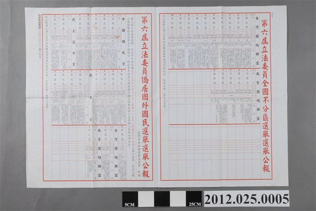 本件為定於2004年12月11日(星期六)上午8時至下午4時舉行投票的第六屆立法委員全國不分區選舉選舉公報(併第六屆立法委員僑居國外國民選舉選舉公報)。不分區選舉計有中國國民黨24名、民主進步黨31名、親民黨19名、台灣團結聯盟10名、無黨團結聯盟5名候選人個人資料;僑民選舉計有中國國民黨5名、民主進步黨6名、親民黨5名、台灣團結聯盟1名、無黨團結聯盟1名候選人個人資料。