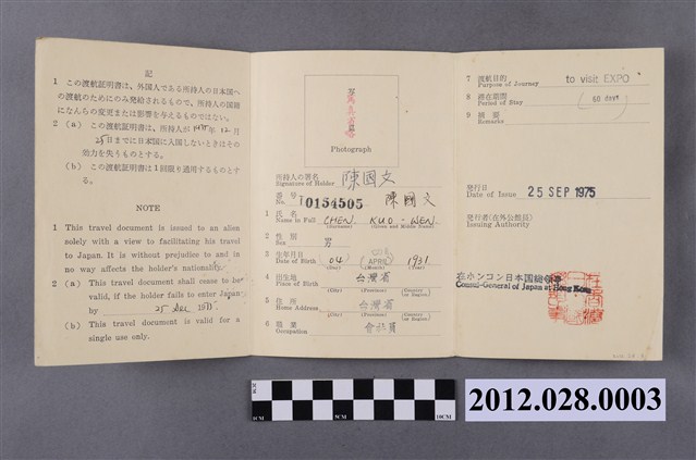 1.本物件為渡航證明書。物件為三折式的文件,正面之最右方頁面的標題為「渡航証明書」,以及英文「TRAVEL DOCUMENT FOR ALIENS」;中間頁面有英文標題「OFFICIAL USE ONLY」;左方頁面有英文標題「OFFICIAL USE ONLY」,標題下方有出國核准章戳。背面中間與右方頁面為持有者「陳國文」的個人資料,並蓋有日本領事的章戳,左方頁面為日文及英文的注意要點。