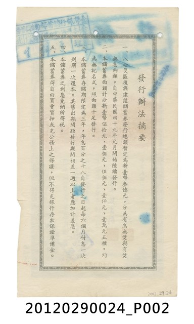 1.本物件為八七災區復興建設儲蓄券,材質為紙。物件右側有裁切破損的痕跡,上側有三個孔洞。正面採藍色印刷,四端印有花形,左上角花形中印「壹仟」,右下方印「新臺幣壹仟圓」,其右側蓋有「9789」編號字樣。物件上方印「臺灣銀行發行」、「八七災區 復興建設儲蓄券」,下接一建物圖樣,建物圖樣以紅色印刷,其左上方蓋有枚藍色方形印,內有「銷訖」、「台灣銀行基隆儲蓄分部」等字樣。右上方印為從反面透印而來的印痕。建物圖樣下方印「憑本儲蓄券於中華民國五十二年陸月一日向臺灣銀行及其各地分行處兌取本金新臺幣壹仟元整」、「董事長 張茲闓」及印、「總經理 王鍾」及印、「中華民國四十九年陸月一日」,其中「陸」為另行蓋上。物件下方印有編號「A040234D」紅字,編號右方有一枚僅能辨識出「臺灣」、「附 52.6.5」的紫色方章,及一無法辨識之紅色小型長方形章。物件背面印有一黑色花紋方框,內載發行辦法摘要,左上方蓋有一藍色方形印,內有「臺灣銀行儲蓄部(有息儲蓄券)」、「台北 本憑證即印花稅總繳」、「經理 于博生」字樣。右上側蓋有藍色「基隆分部售出」字樣。中、下方可見兩枚從正面透印過來的「陸」字印痕。