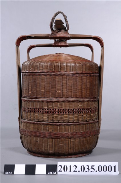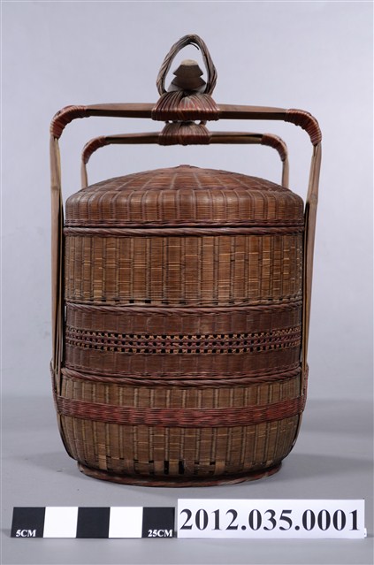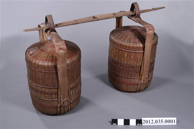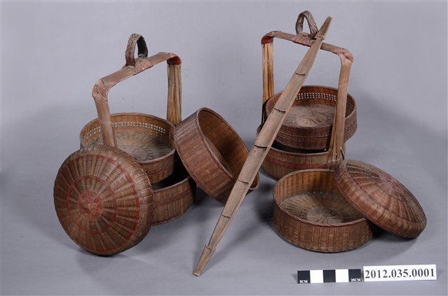 1、本件為嘉義市陳村吉先生(父親陳永,經營天龍製藥廠;祖父陳憨存,經營米店)捐贈的大型三層竹編謝籃組,共有兩件謝籃及一件挑送謝籃的竹製扁擔。捐贈人表示該物件在他出生前早由祖父購入,已近80年。