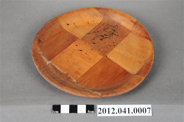 上有黑色汙點,根據捐贈者描述該件係由其父親羅賢榮所收藏,使用的年代約在民國40~50年代之間,上面的花紋是貼皮而非彩繪。此物件應該為塑膠物品尚未量產,一般市街小民所使用,由於輕便、耐摔等特性,一般家庭均有使用相關的產品,作為裝盛水果、乾果使用。