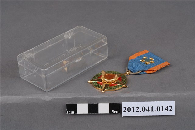 寶星獎章分1至9星。本章為5星寶星獎章,捐贈者父親(羅賢榮)於民國55年獲頒獎章,表示其當時於陸軍服務滿15年以上,最近3年考績甲等以上獲頒獎章。背後刻有編號:556975。