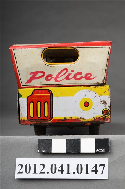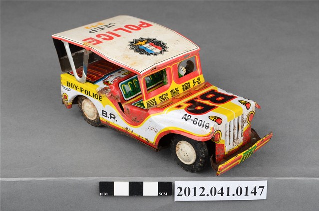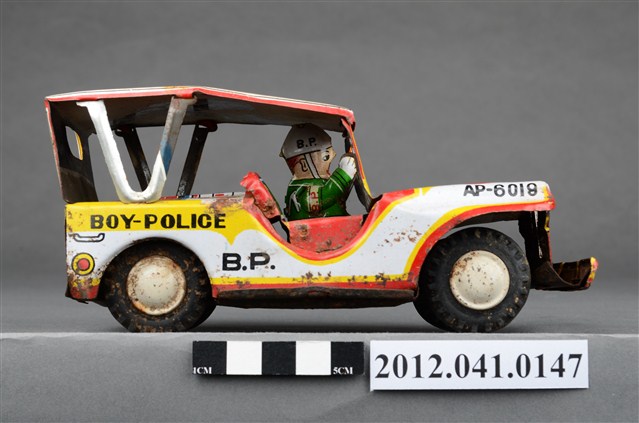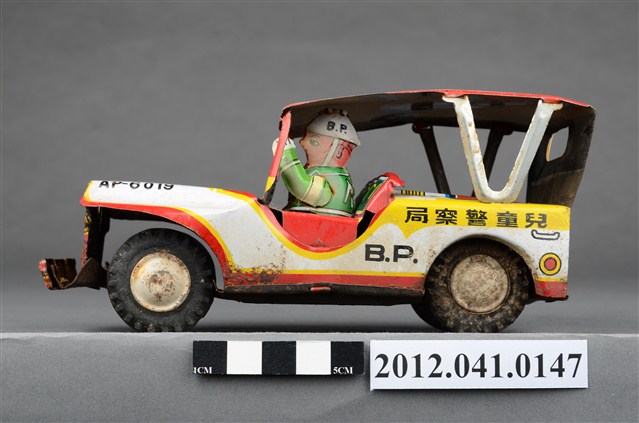 本物件為兒童警察局警車造型玩具,駕駛座有頭戴白色頭盔之人員,車頂由車頭至車尾印有黑字「B.P.」、「POLICE JEEP」之徽章圖案、紅字「POLICE」、黑字「JEEP」、黃字「372」;車頭印有黑字「兒童警察局」、車燈、綠底黃字車牌「U.S.P.372」,車尾印有紅字「Police」。
