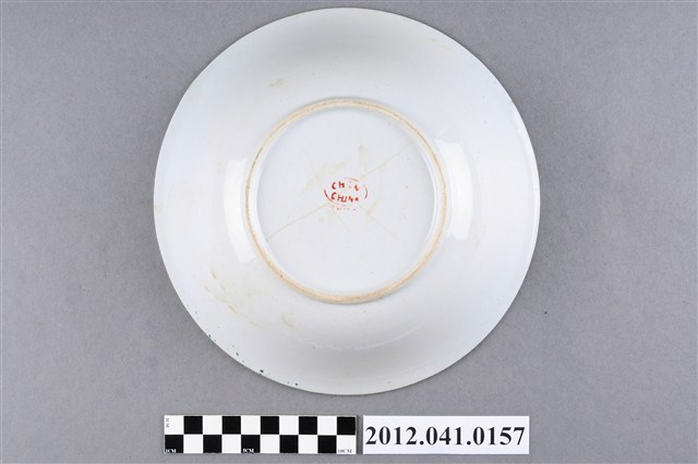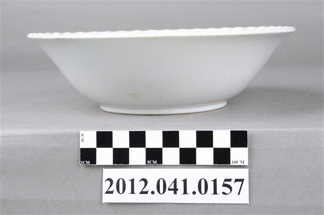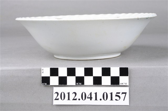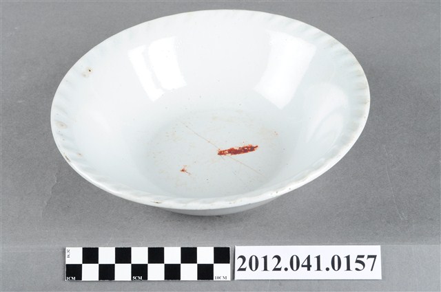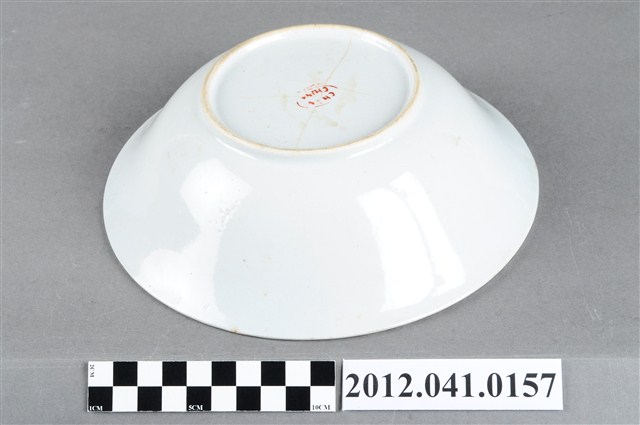 1.這件紅彩白瓷花口碗,器形呈敞口外折,折沿口並壓印斜向的篦劃紋作花邊,圓腹,弧壁至底部漸收,大圈足。圈足刮釉露胎,胎色呈米白色,胎質細緻精良,碗底有幾道裂痕。通體施釉,釉面有光澤,全器除口沿壓印紋飾之外呈素面白瓷原貌,僅碗底有一道紅色花押記號。圈足底帶有紅色的橢圓形款識,內書「CHIN CHINA」及「HWANG」,應是窯廠與作者之款。