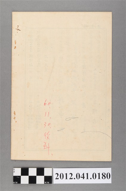 1.本件為「民國60年中尉任官令」,為捐贈者之父親羅賢榮所持有的各類履歷資料,此為中尉任官令。直式直書,右側釘裝,大致保存完整。封面右上角有二行附註「應視同極機密文件保管」,底部有一印痕為「中尉軍醫羅賢榮」。2.第一頁為「任官令」第○○六號,中華民國六十二年二月四日,右下有「總統之印」,內容為二一五員晉任記載;封底內頁印有「總統 蔣中正」、「行政院院長 嚴家淦」、「國防部部長 黃杰」、「參謀總長空軍一級上將 賴名湯」。3.羅賢榮軍種官科為陸軍軍醫,原任官階為少尉,晉任官階為中尉,服務單位為陸軍預備第六師,生效日期為59年10月1日。