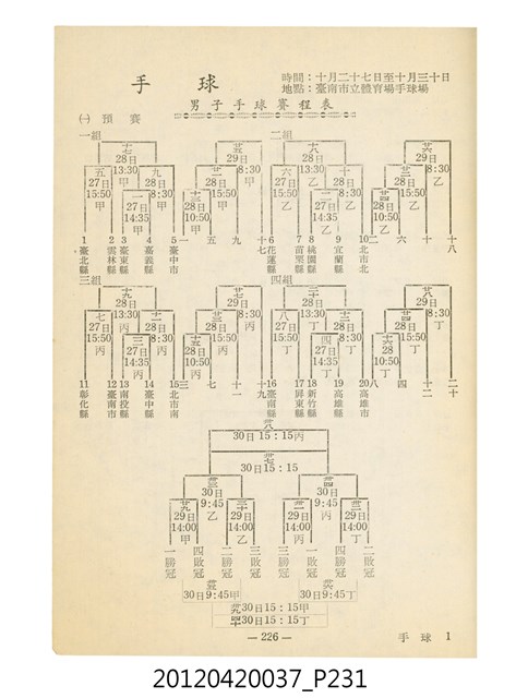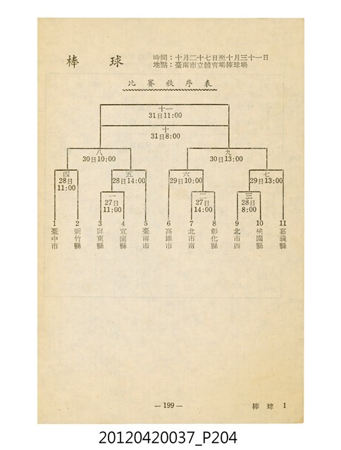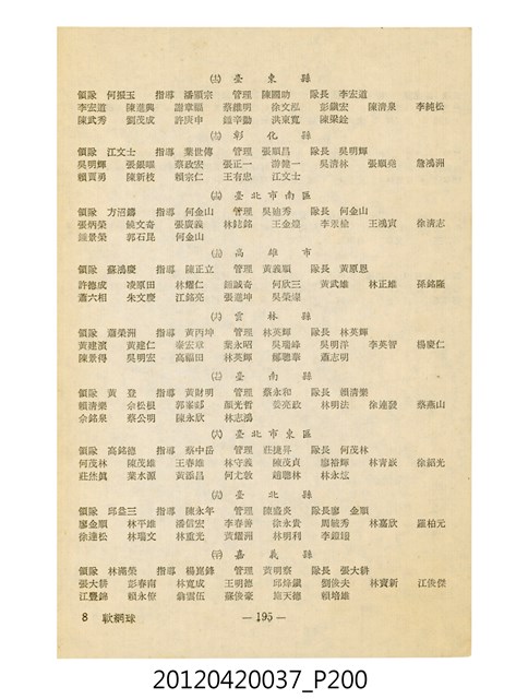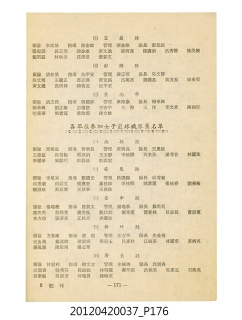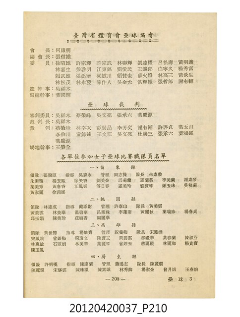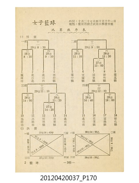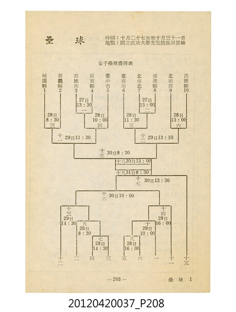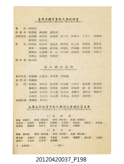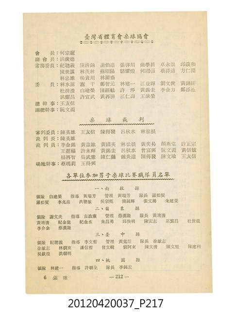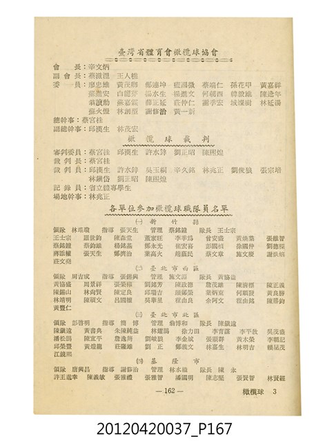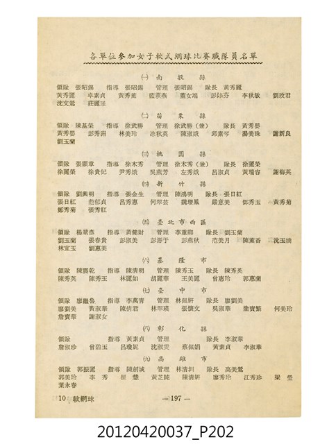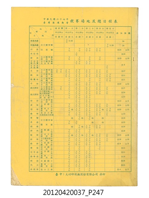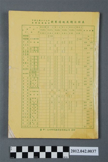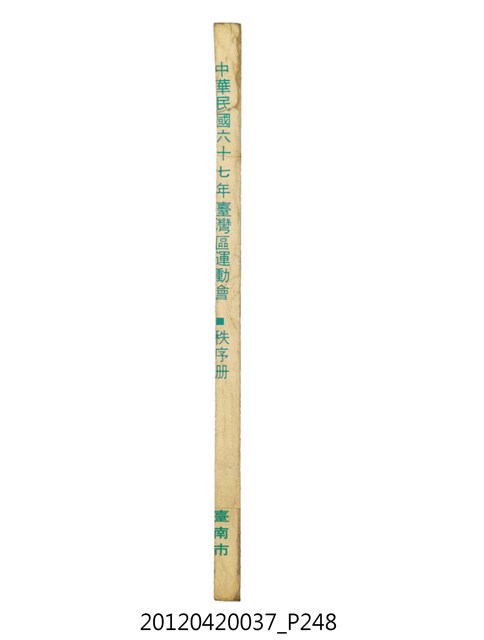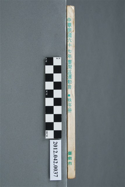 民國六十三年開始全省運動會改為臺灣區運動會,每年舉辦自民國六十三年至民國八十七年總共舉辦25屆。中華民國六十七年台灣區運動會於民國六十七年十月二十六日至十月三十一日在臺南市舉行,秩序冊封面設計以黃色為底中間以21個綠色方框,方框內有運動人形代表21項比賽項目,搭配銀色台灣區運圖騰,封底為運動會各項比賽場地與日程表。秩序冊記載開幕典禮與閉幕典禮儀式與表演安排以及裁判、計時、記錄人員及參賽者組成名單和號碼,為賽事舉行的主要依據包括比賽規約、賽制、賽事項目的日程和分組表,並提供交通規劃、動線與地點安排等資訊。