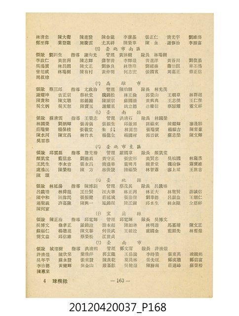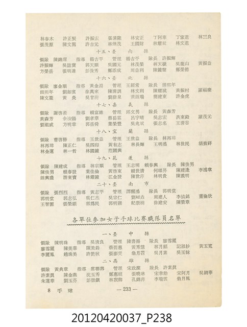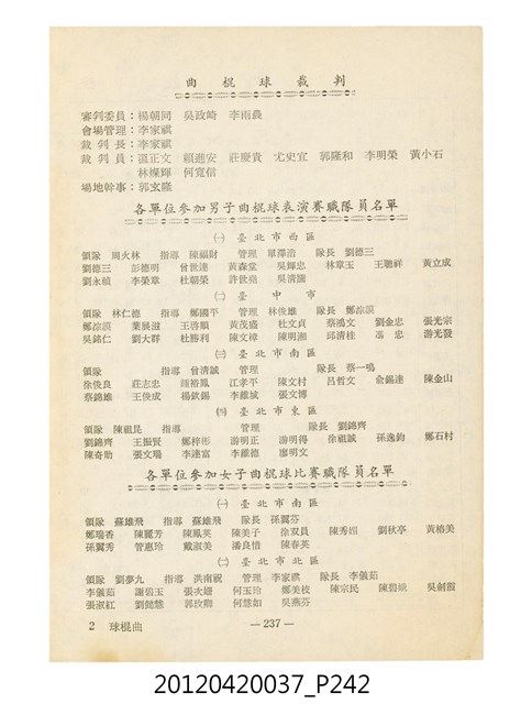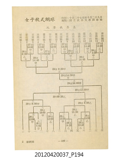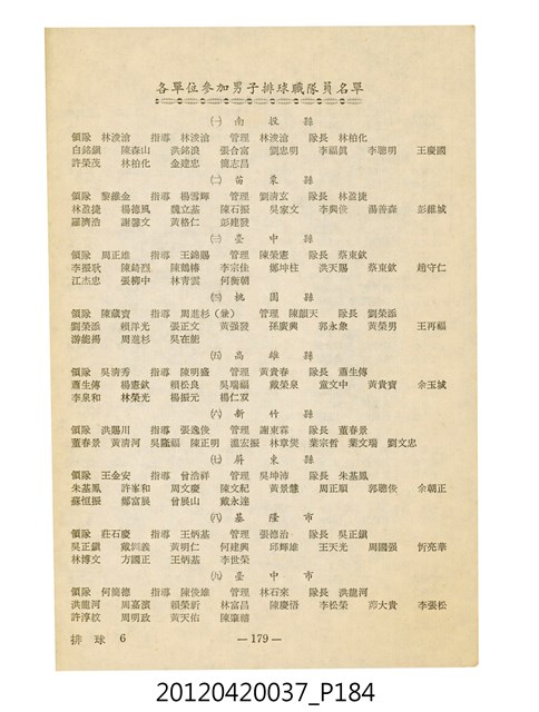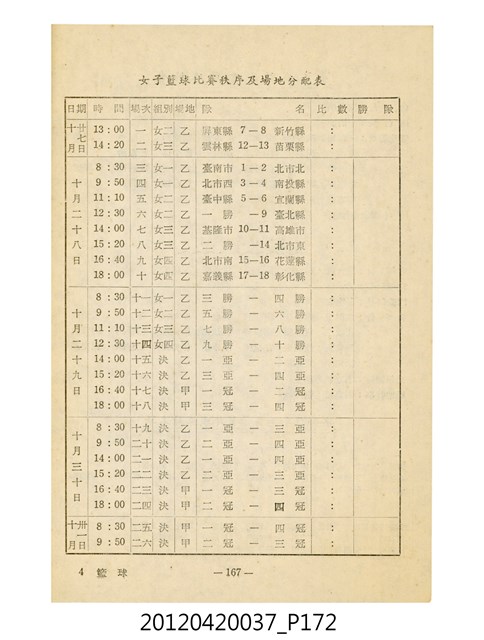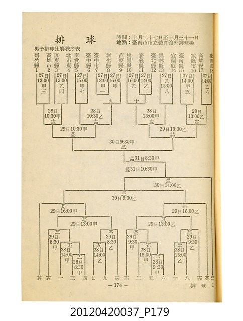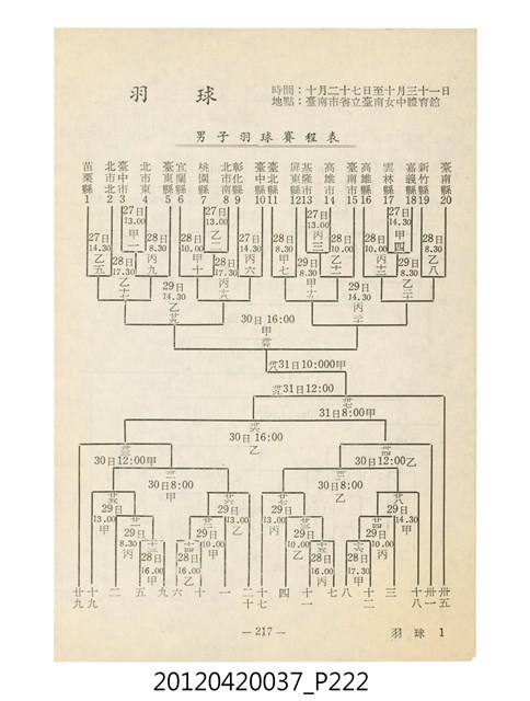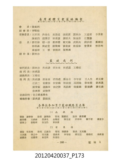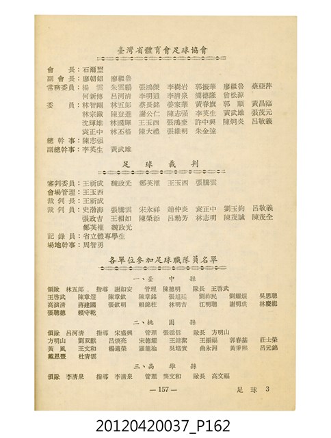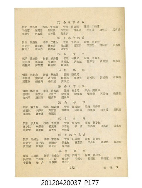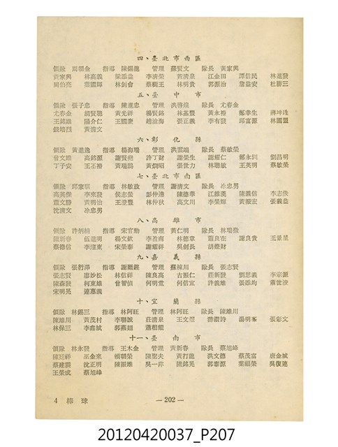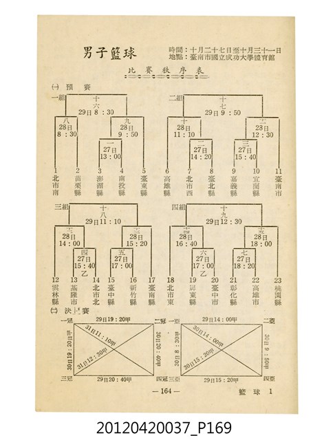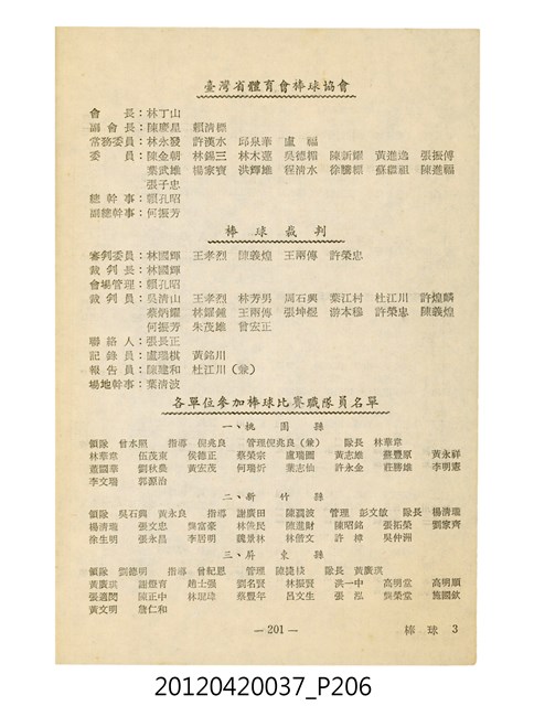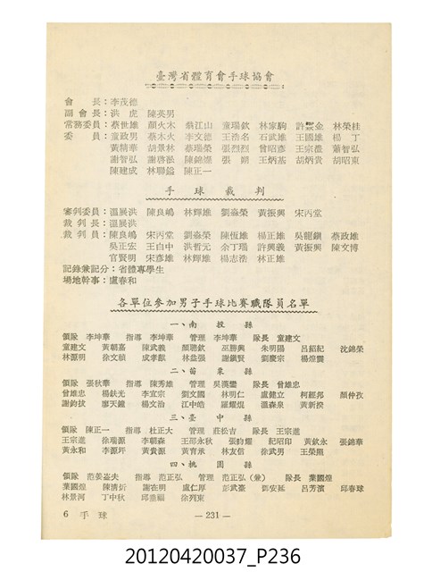 民國六十三年開始全省運動會改為臺灣區運動會,每年舉辦自民國六十三年至民國八十七年總共舉辦25屆。中華民國六十七年台灣區運動會於民國六十七年十月二十六日至十月三十一日在臺南市舉行,秩序冊封面設計以黃色為底中間以21個綠色方框,方框內有運動人形代表21項比賽項目,搭配銀色台灣區運圖騰,封底為運動會各項比賽場地與日程表。秩序冊記載開幕典禮與閉幕典禮儀式與表演安排以及裁判、計時、記錄人員及參賽者組成名單和號碼,為賽事舉行的主要依據包括比賽規約、賽制、賽事項目的日程和分組表,並提供交通規劃、動線與地點安排等資訊。